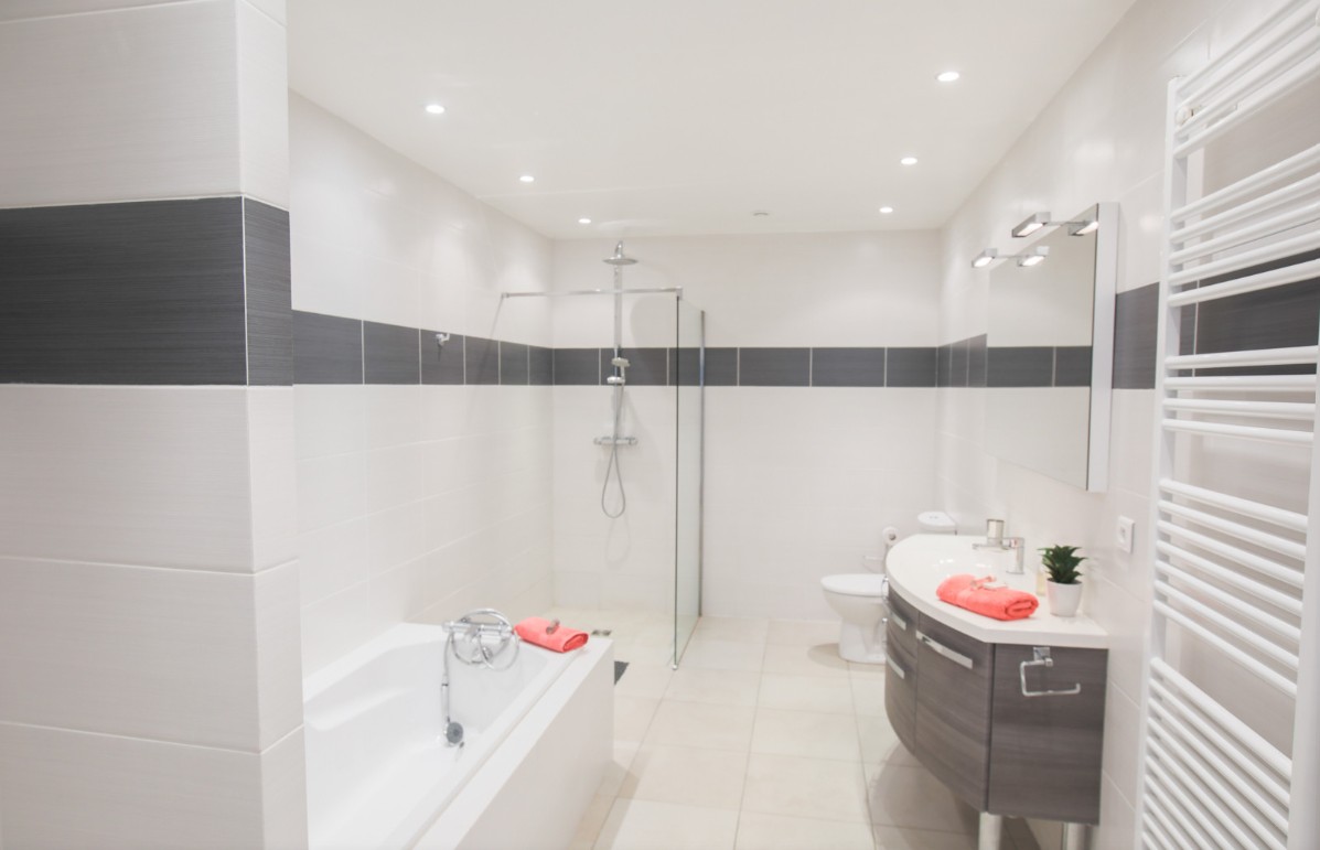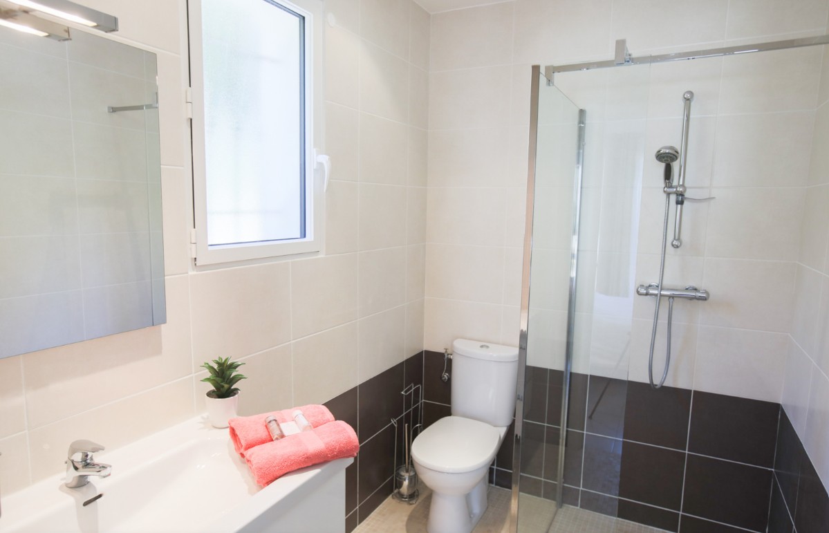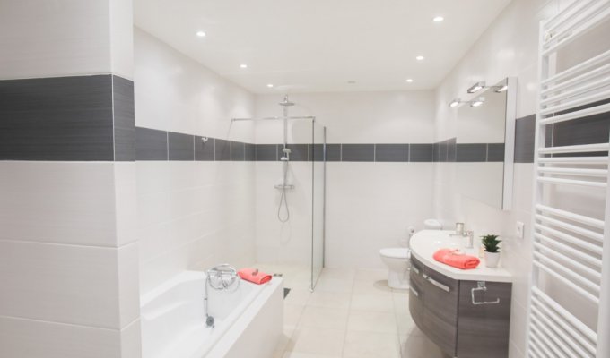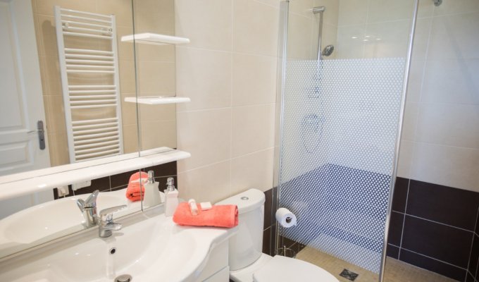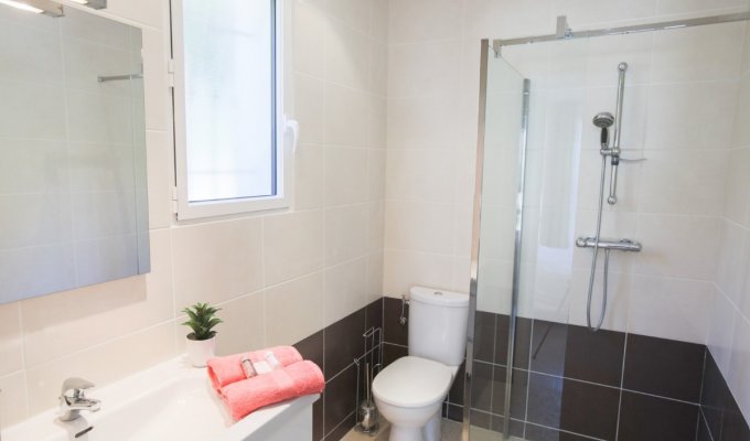 2 salles de bain avec baignoire et WC et 2 autres salles de bain avec douche et WC ainsi qu'un autre WC indépendant (3 salles de bain sont en-suite et la 4ème salle de bain est partagée avec 2 chambres). Coin lingerie avec lave-linge et sèche-linge.
