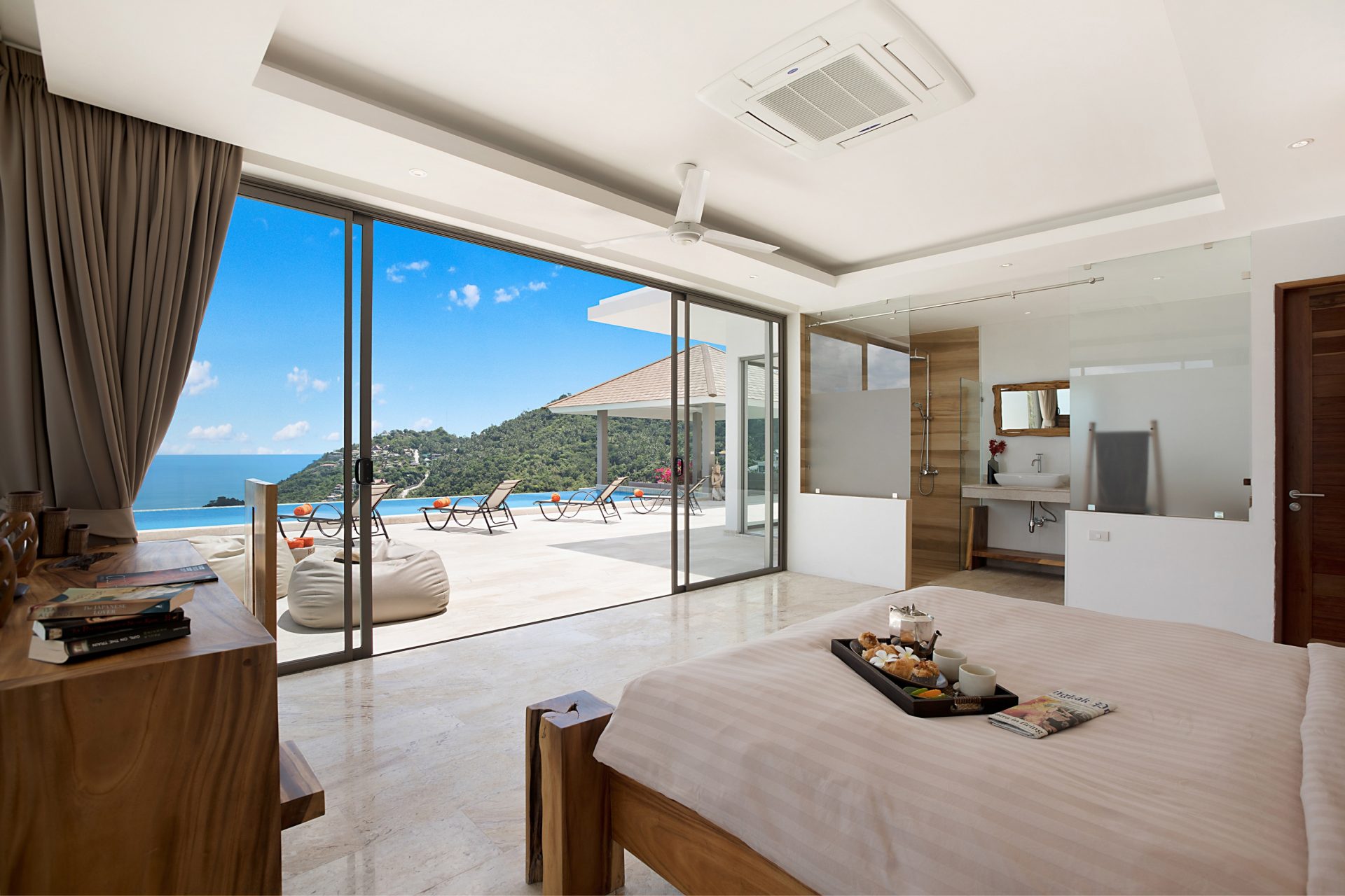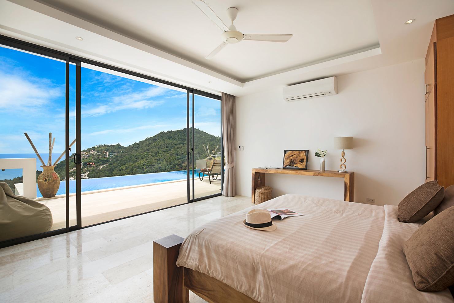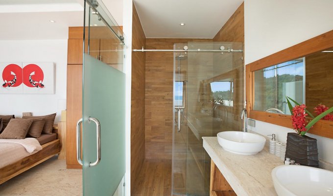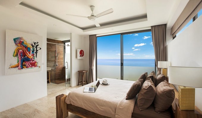 La villa dispose de 4 grandes chambres avec lits king-size, chacune avec sa salle de bain attenante et un balcon avec une vue spectaculaire sur l’océan. Toutes bénéficient de baies vitrées du sol au plafond afin de profiter pleinement des vues panoramiques. Une chambre offre une vue sur le jardin.