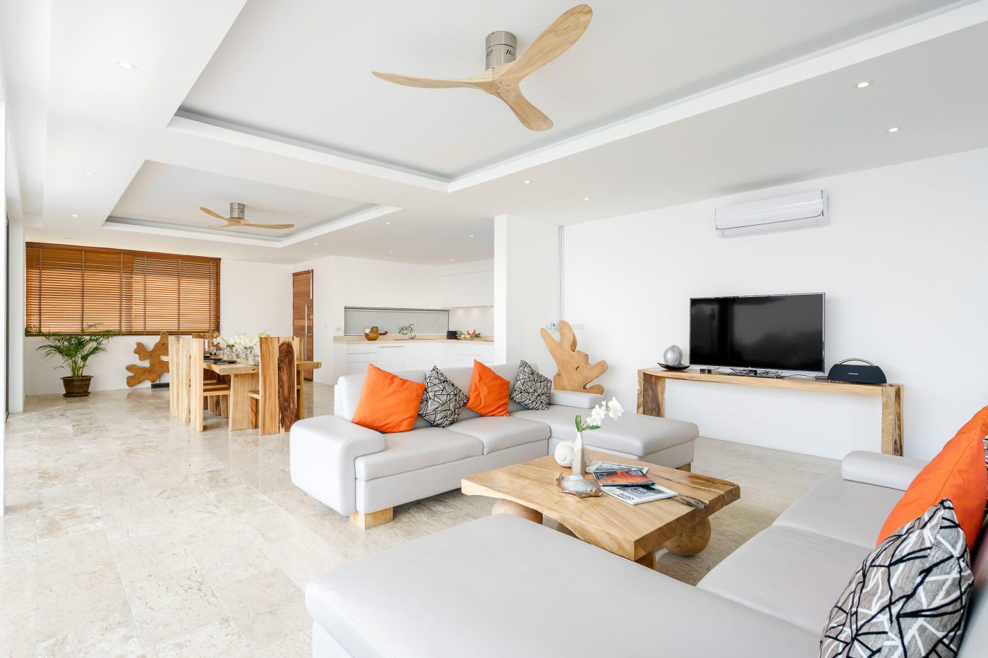Il y a une cuisine européenne moderne entièrement équipée ainsi qu’un vaste salon et une salle à manger, tous offrant une vue imprenable sur la mer.