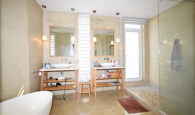 Chambre principale : Vue sur la mer, lit queen, dressing, salle de bains attenante avec baignoire + douche + WC, balcon privé