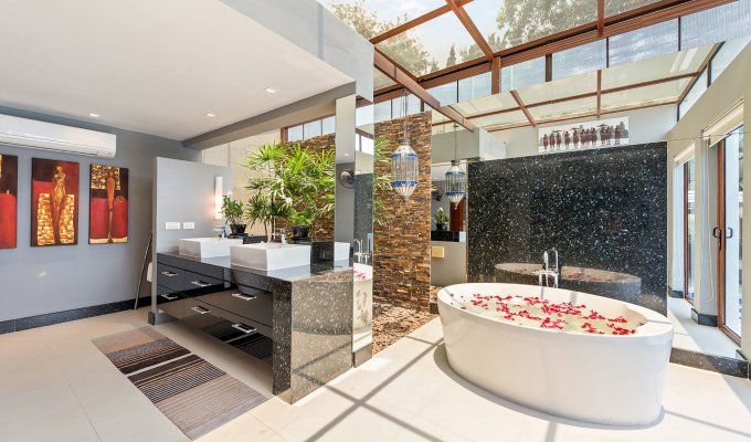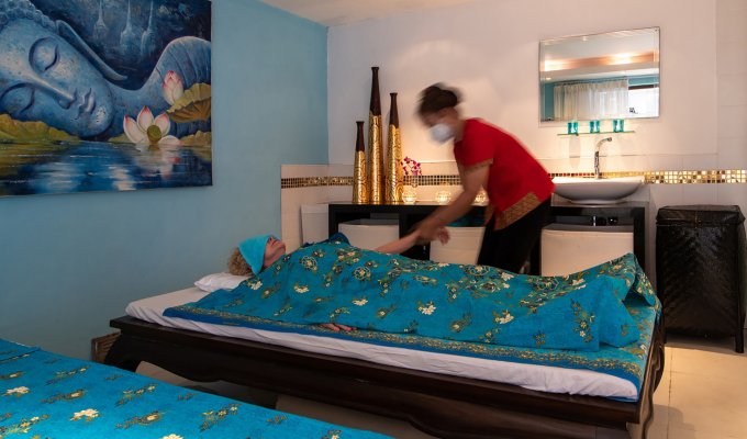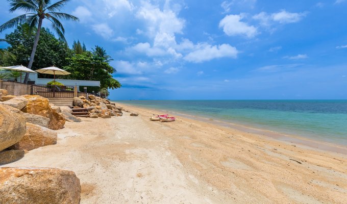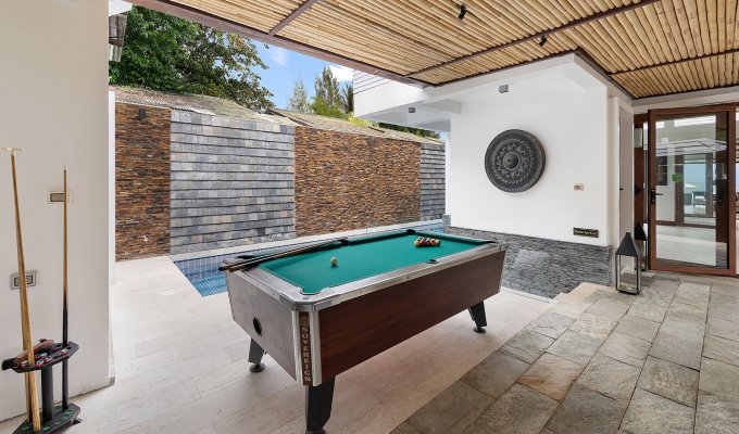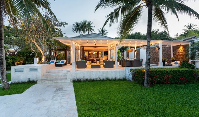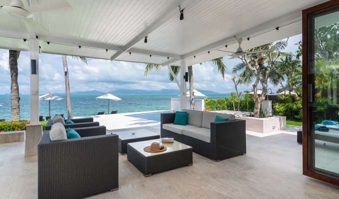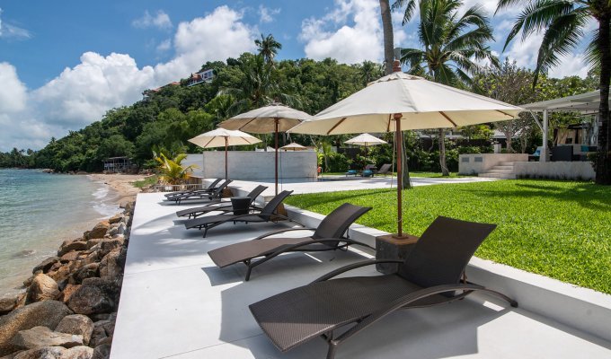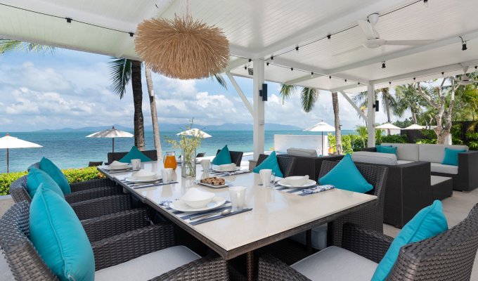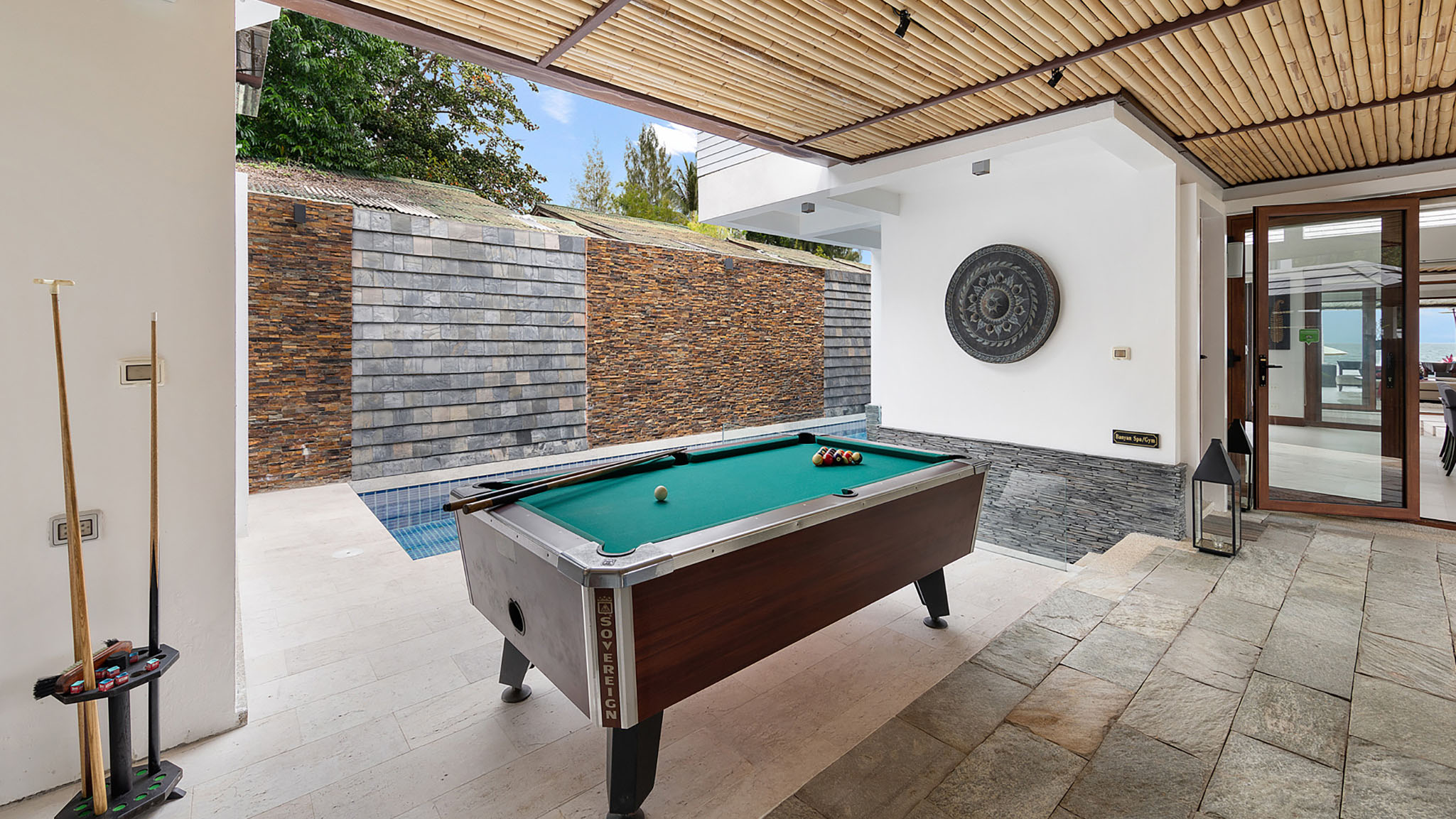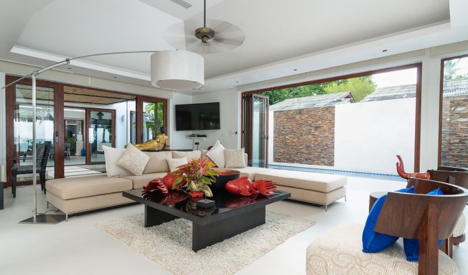 La villa est conçue comme un ensemble de pavillons menant à la plage de sable, avec une somptueuse piscine qui s'étend sur presque toute la longueur. Passez vos journées à discuter avec vos amis dans le salon principal, avec une vue imprenable sur la plage et de grandes portes vitrées pliantes qui permettent de profiter pleinement de l'intérieur et de l'extérieur. Les soirées peuvent être passées sur la terrasse commune du jardin, allongé sur des chaises longues, ou à profiter d'un massage thaïlandais en couple dans la salle de massage au bord de la piscine, avec pour seule distraction le bruit des vagues.