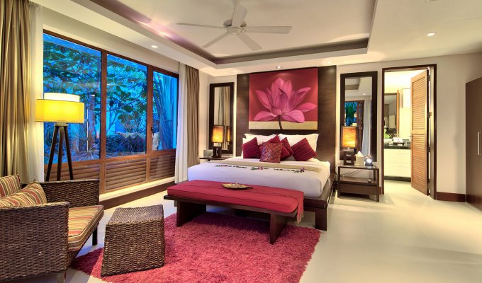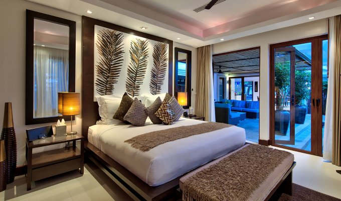 Les cinq chambres spacieuses et lumineuses sont toutes équipées de lits king-size et de salles de bains attenantes avec lavabo simple ou double, ainsi que de douches à l'italienne ou de baignoires. La décoration des chambres est dans le même style que le reste de la villa, avec un sol blanc cassé contrastant avec le mobilier en bois foncé d'inspiration thaïlandaise. Toutes les chambres sont climatisées et équipées d'un ventilateur de plafond, d'un coffre-fort personnel, d'une télévision à écran plat et d'une chaîne hi-fi Bose ou Sony.
