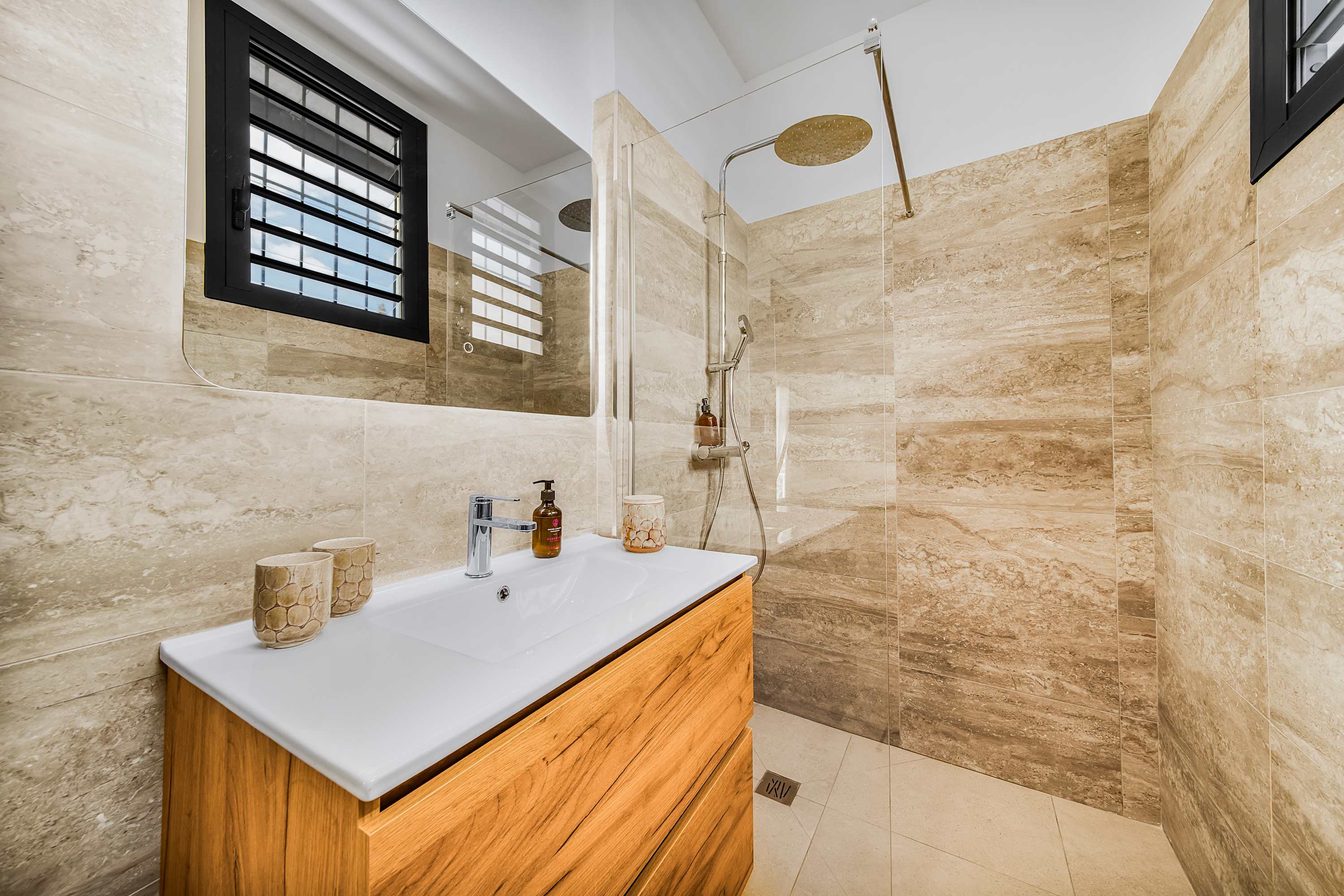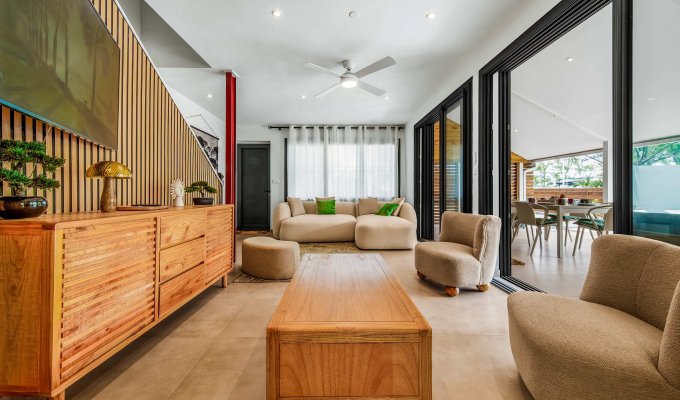 En entrant dans la villa, vous arrivez directement sur un salon avec cuisine ouverte, lumineux et convivial.
