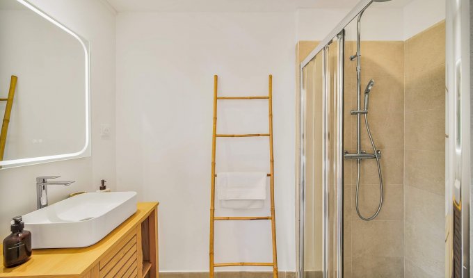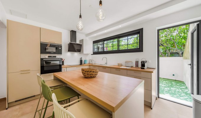La cuisine est entièrement équipée pour la location saisonnière, avec notamment un lave-vaisselle, une cafetière Nespresso ou encore tous les ustensiles pour préparer de petits repas. en famille ou entre amis.