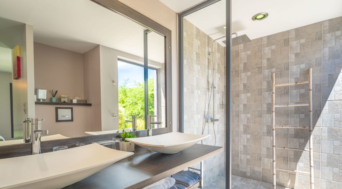 Les matériaux nobles et les bois exotiques confèrent à la villa une authenticité remarquable, tout en bénéficiant des dernières technologies pour un confort moderne. Orientées plein sud, la piscine et la terrasse avec jacuzzi profitent d’un ensoleillement optimal tout au long de la journée.