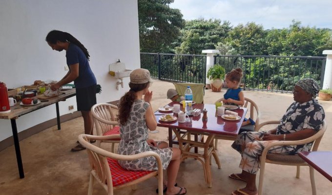 Le jardin verdoyant est un véritable havre de paix où vous pourrez vous relaxer dans un hamac, à l’ombre des bananiers, papayers, manguiers et avocatiers. Vous pourrez observer de nombreux oiseaux colorés et, à l’occasion, des babouins, tout en profitant du calme environnant. Le jardin abrite également divers arbres fruitiers — mandariniers, orangers, citronniers, grenadiers, goyaviers et passiflores — dont les fruits sont utilisés dans les repas frais et faits maison préparés par notre cuisinier.