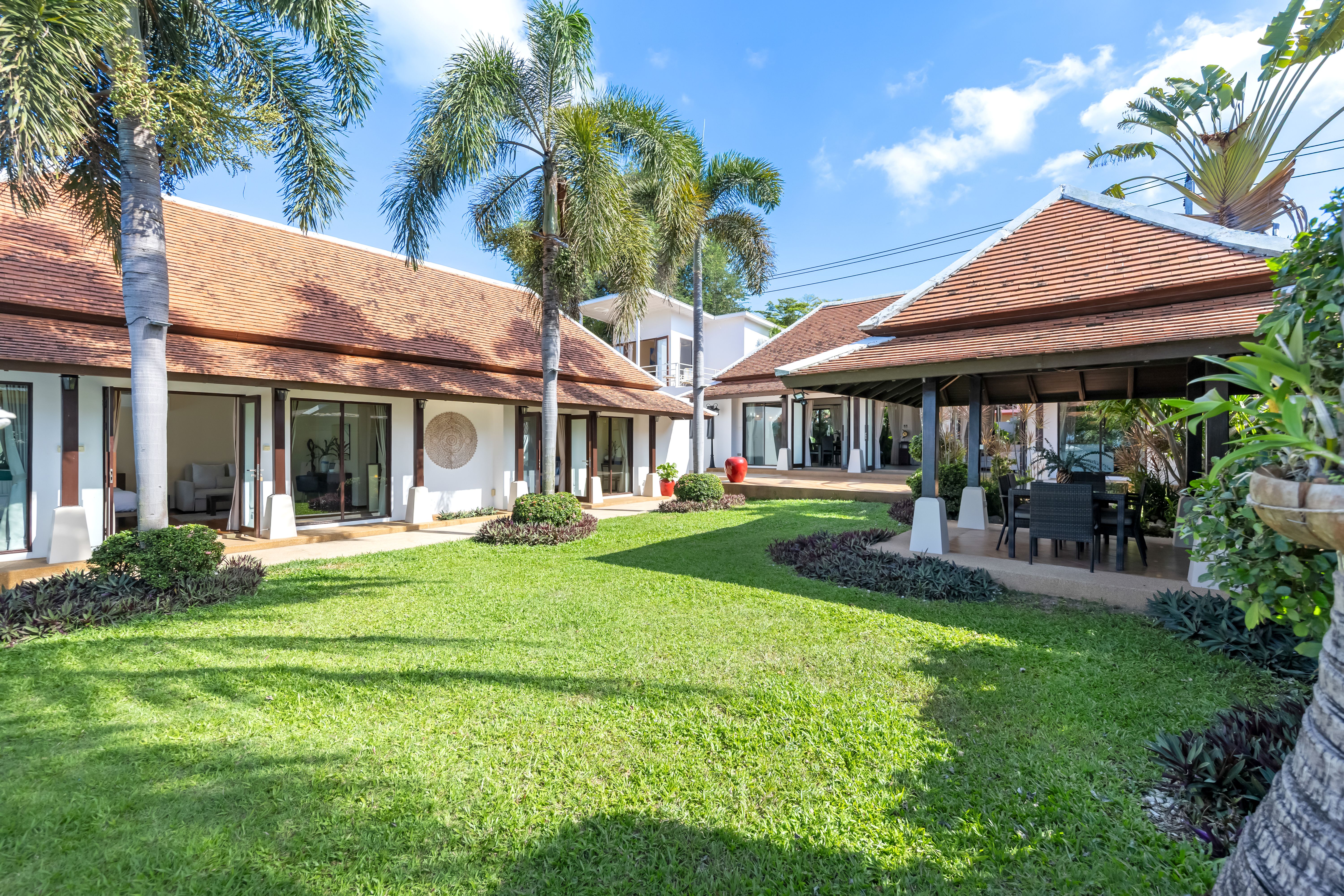 À l’entrée de la villa, les invités traversent un écrin de verdure avant d’arriver dans une vaste salle à manger élégamment décorée, et le mobilier asiatique ont été sélectionnés avec un goût remarquable. Offrant une vue sur l’ensemble du jardin et de la piscine, la salle à manger est complétée par une grande cuisine adjacente garantissant un service fluide et efficace.