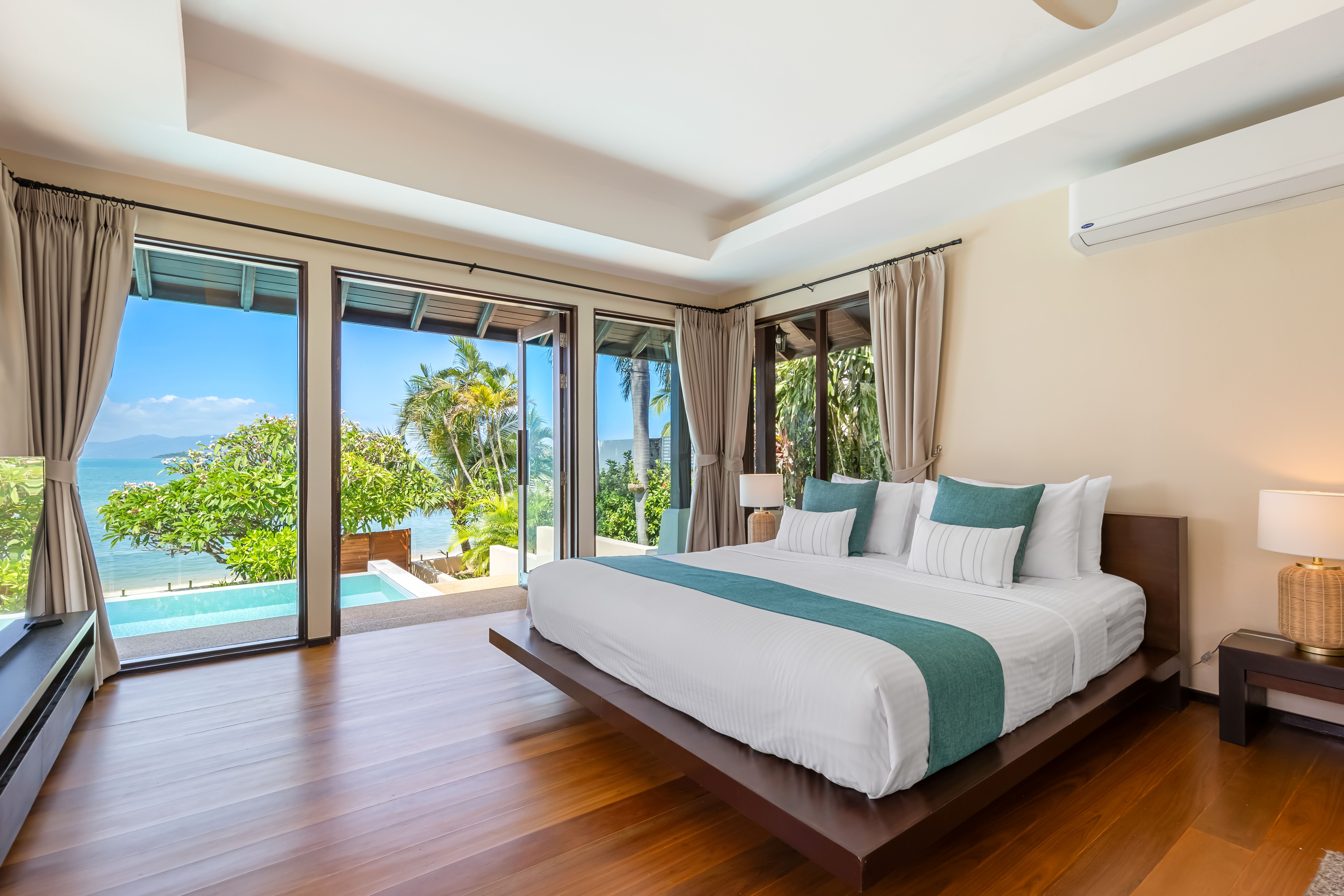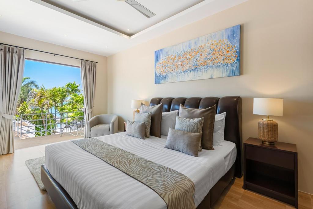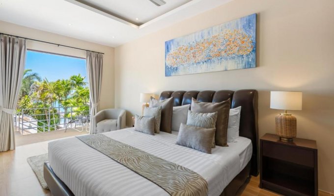 La suite parentale offre une vue panoramique sur la mer et se trouve à seulement quelques pas du sable blanc et fin.