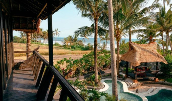 La villa unique en bord de mer est située à seulement quelques mètres de la plage de sable fin. Il est construit dans le style antique mixte du patrimoine culturel de Sumatra, Kalimantan et Flores. Si vous êtes à la recherche d'un endroit paisible pour vous détendre et souhaitez séjourner près de l'océan entouré de palmiers et de rizières, cette incroyable villa est parfaite.