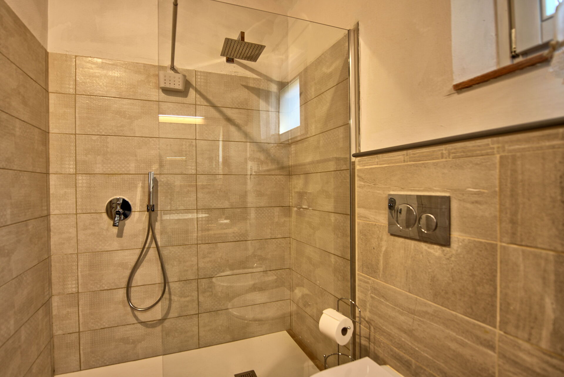 Rez-de-chaussée: salon avec salle à manger et coin cuisine (four, congélateur, lave-vaisselle), cellier avec lave-linge et sèche-linge, chambre double, salle de bain avec douche, chambre double avec salle de bain privée avec douche. Terrasse panoramique couverte et aménagée pour manger et se détendre en plein air.
