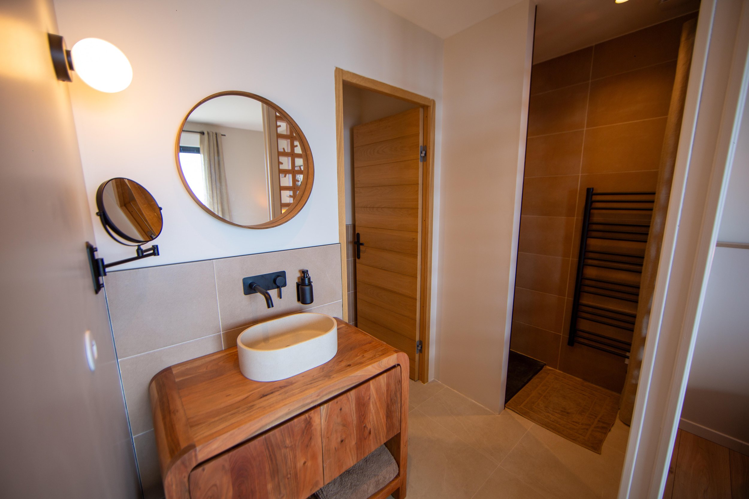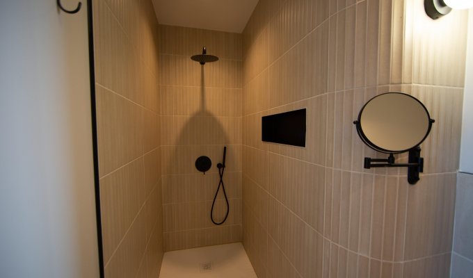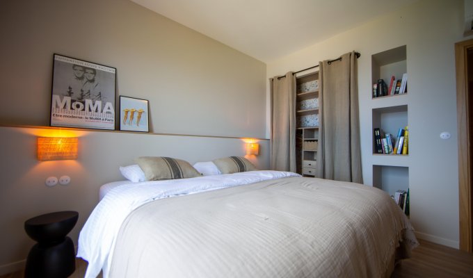 Chambre double (lit 180 cm), TV, vue mer, dressing, salle de bain privative (douche, simple vasque, WC séparés)