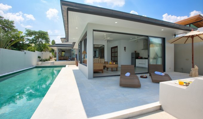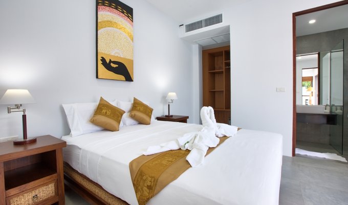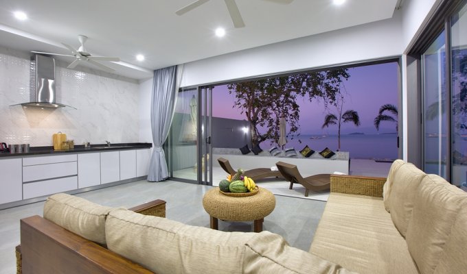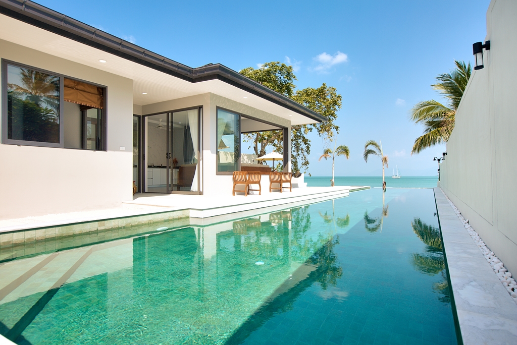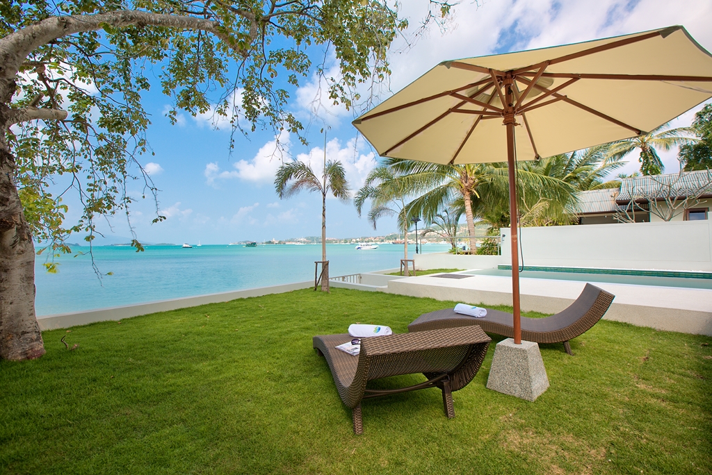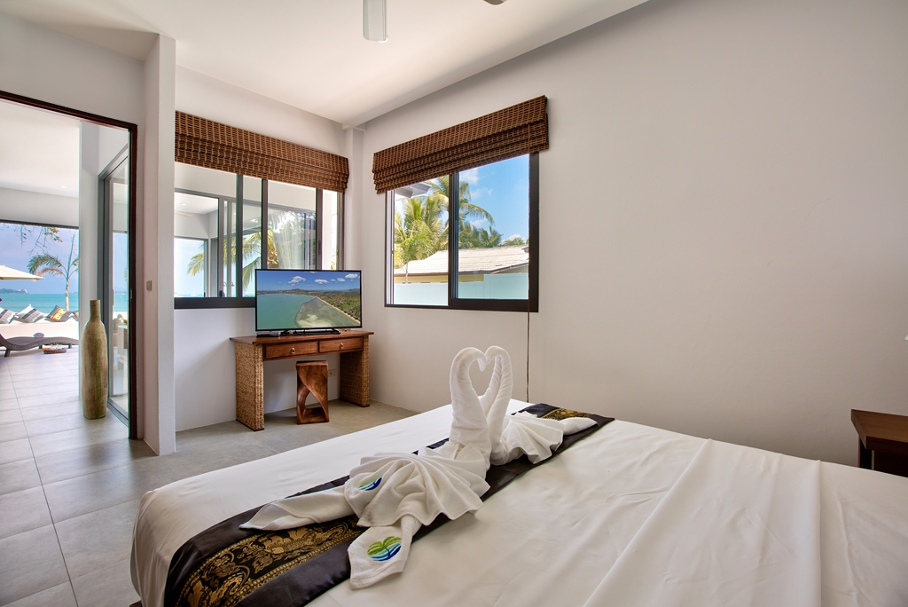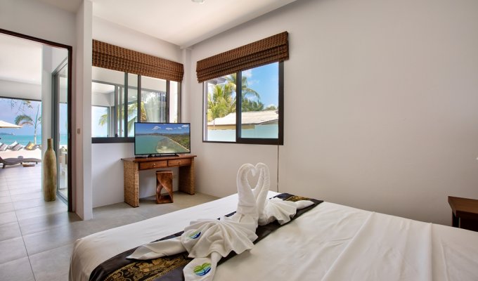 Enfin, la villa d’une chambre en bord de mer complète cet ensemble. Elle dispose également d’un espace salon/salle à manger avec cuisine moderne, ainsi que d’une chambre avec lit queen size, télévision à écran plat et salle de bain privative élégante. Cette villa offre une vue imprenable sur la plage et la piscine. L’art thaïlandais orne chaque mur ainsi que les moindres détails décoratifs (coussins, plaids, sculptures), créant un espace à la fois moderne et empreint de tradition. Que ce soit à l’intérieur, en admirant la décoration raffinée, ou à l’extérieur, sous le ciel clair de Samui, cette villa est idéale pour les amateurs de luxe et de détente, promettant des vacances inoubliables.