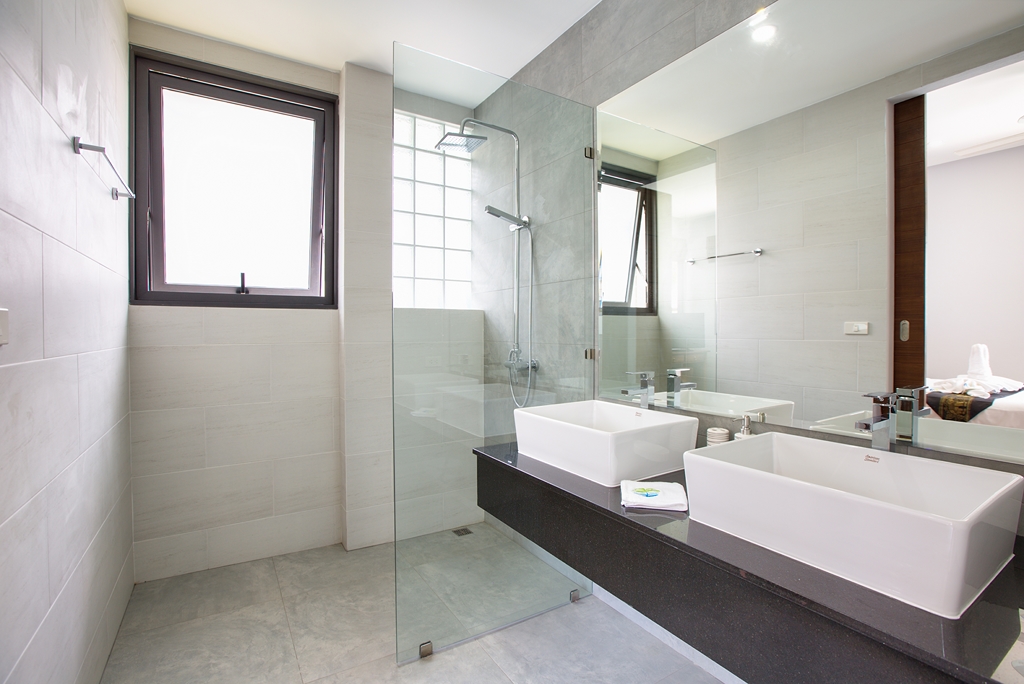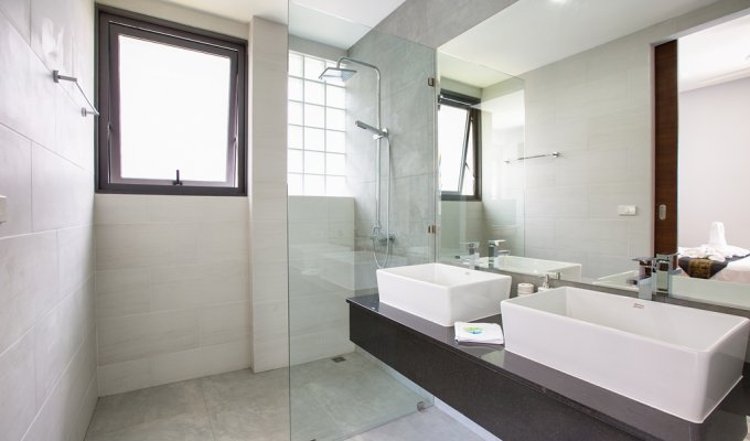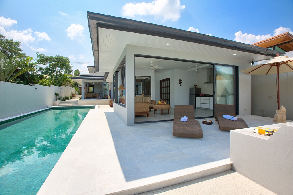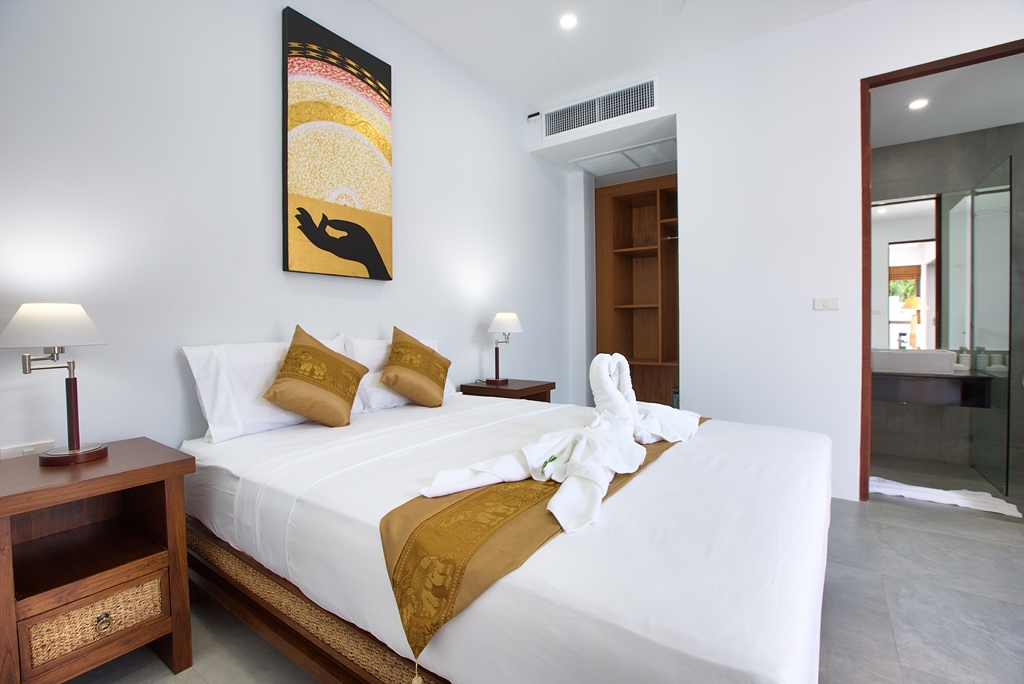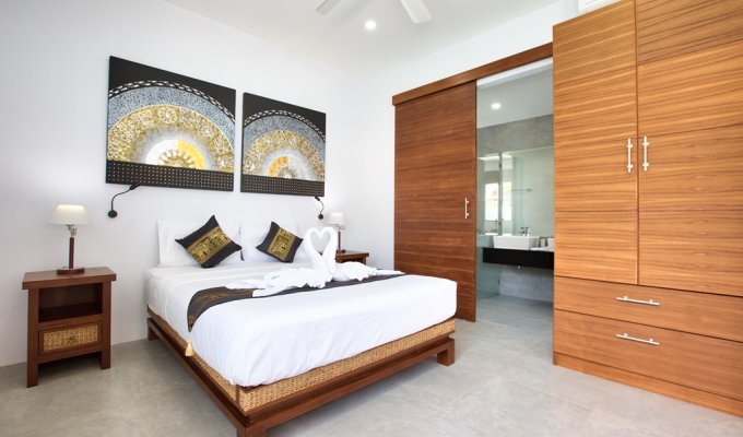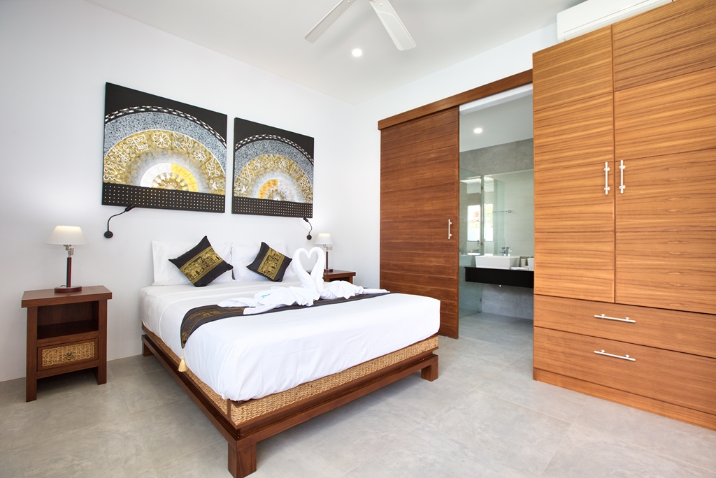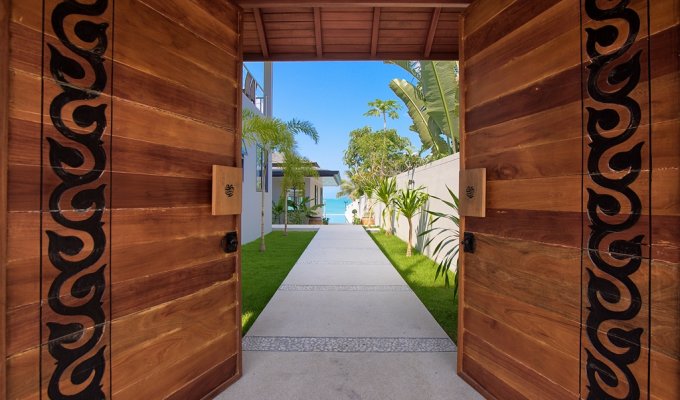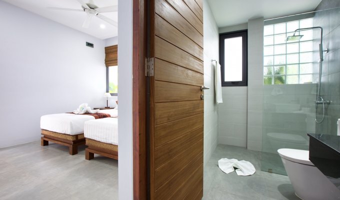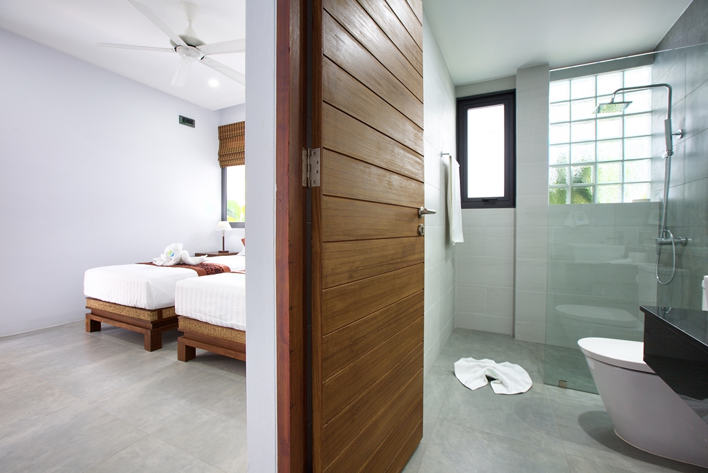 En franchissant ses grandes portes doubles en bois, vous accédez à une longue allée surplombant une vaste piscine de 20 mètres, avec en toile de fond les eaux cristallines de la plage de Bangrak. Immédiatement sur votre gauche se trouve la villa en duplex de 4 chambres, comprenant 3 chambres au rez-de-chaussée, chacune avec sa propre salle de bain attenante moderne et élégante, équipée de douches à effet pluie – parfaites pour les invités. Les chambres peuvent être configurées avec des lits jumeaux ou des lits queen size.
