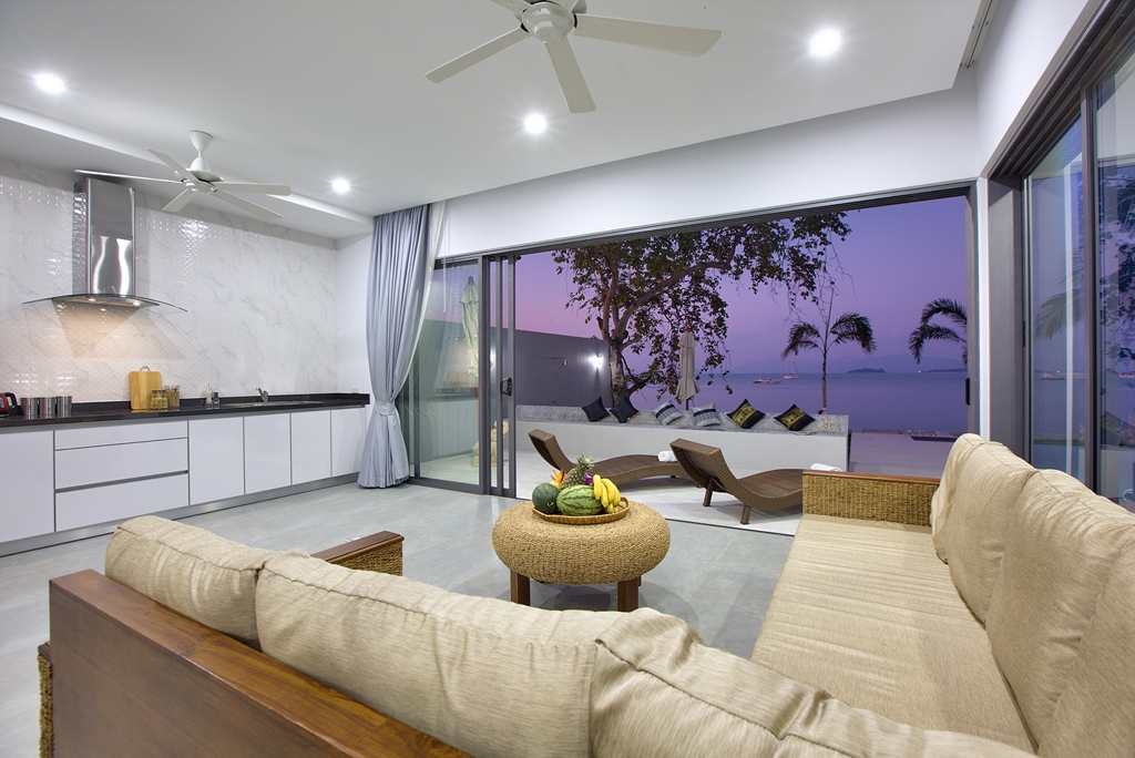 En montant les escaliers, vous accédez à un vaste espace extérieur ouvert où la salle à manger et la cuisine se fondent en un seul espace, avec un grand salon/salle à manger extérieur offrant une vue imprenable sur la mer. La cuisine moderne, parfaitement intégrée à la maison, est située à côté de la terrasse de repas et dispose de tous les équipements occidentaux : micro-ondes, four, double réfrigérateur/congélateur et tout le nécessaire moderne. Elle permet de recevoir facilement amis et famille, devenant ainsi le cœur de la maison où convivialité et gastronomie se rencontrent. Le salon intérieur attenant à la cuisine est équipé d’une télévision à écran plat et d’une barre de son pour vos moments de divertissement.