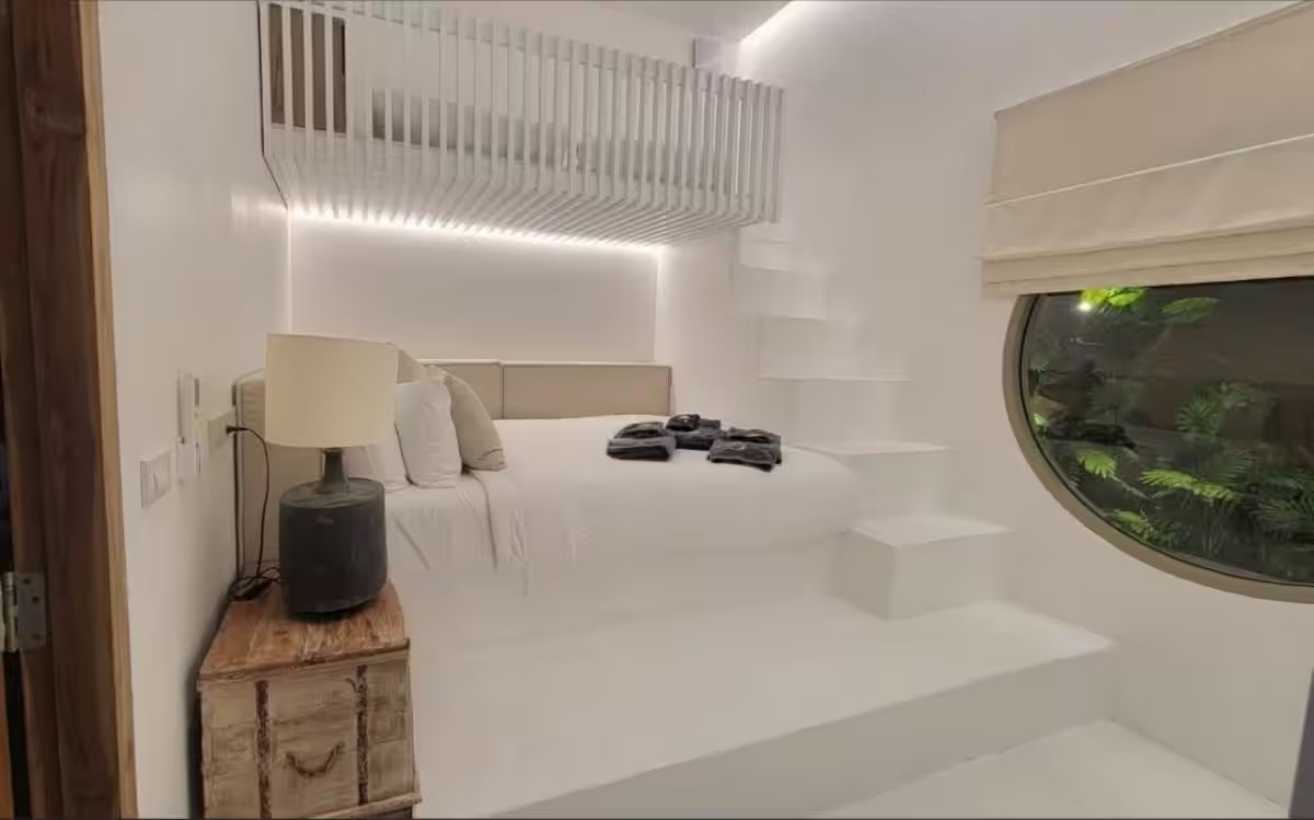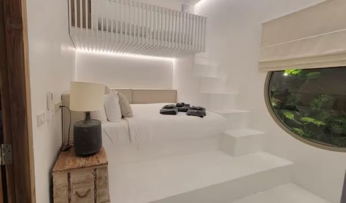 Le niveau inférieur comprend d’autres chambres : deux chambres avec salle de bain attenante et lits king-size, ainsi qu’une chambre double avec salle de bain attenante comprenant un lit double et des lits superposés. Chaque chambre, à chaque étage, donne accès à un balcon commun offrant une magnifique vue sur la mer.
