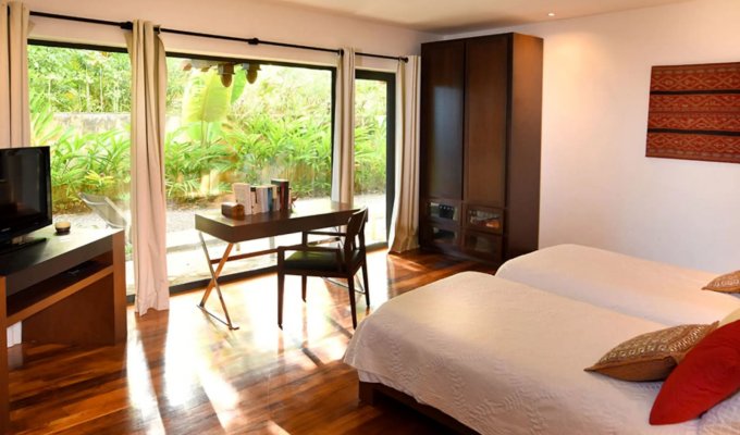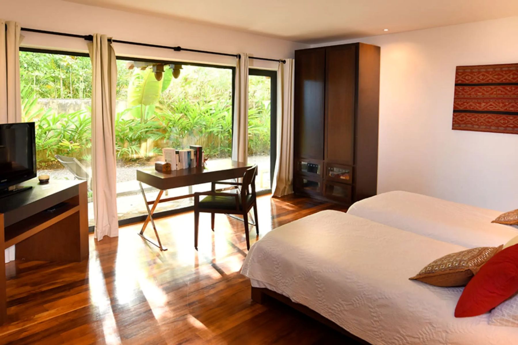 La villa offre une surface habitable de 400 m², au cœur d’un splendide jardin tropical de 3 000 m², créant un cadre idyllique pour des vacances inoubliables.