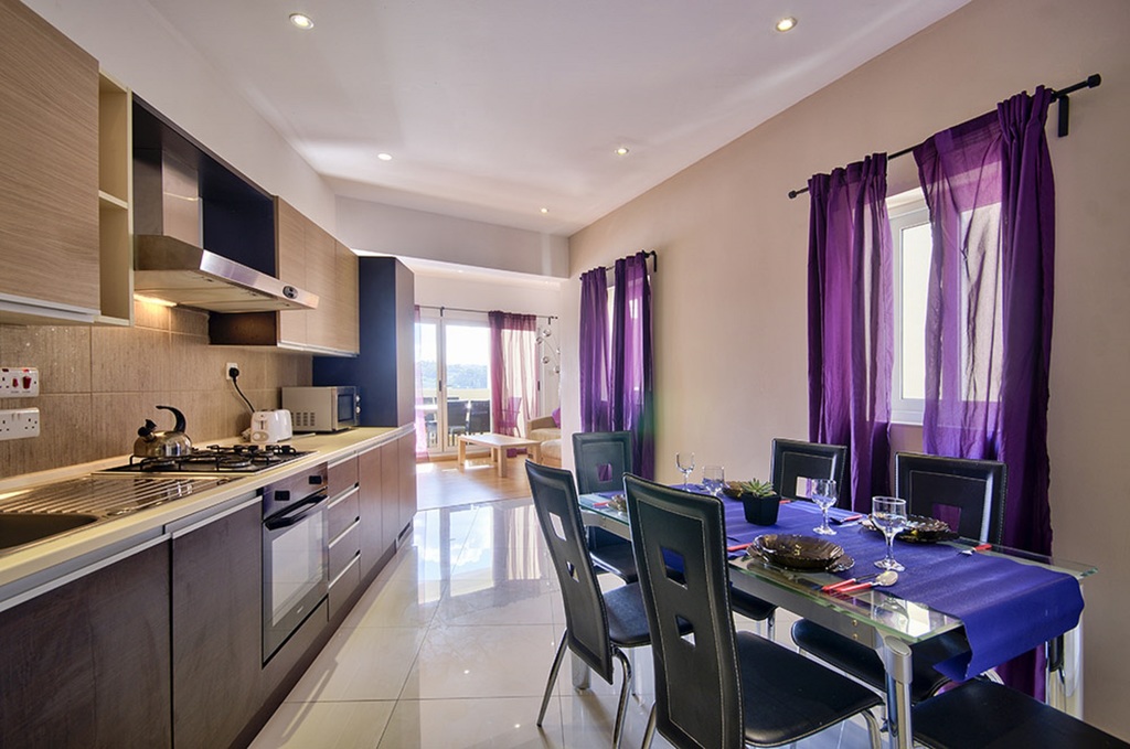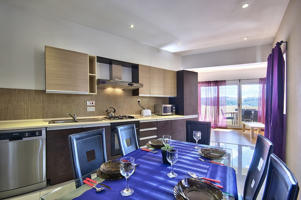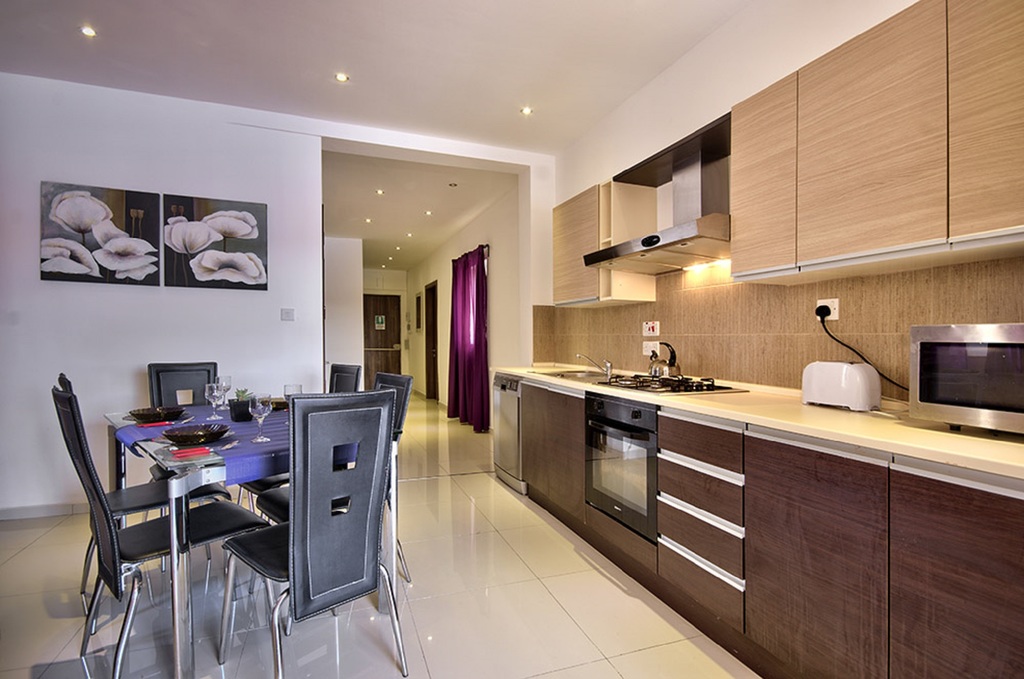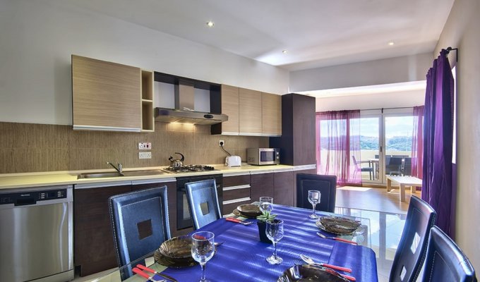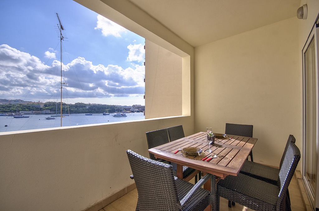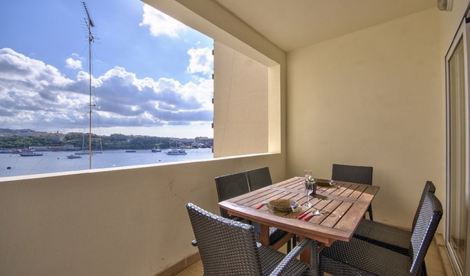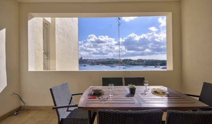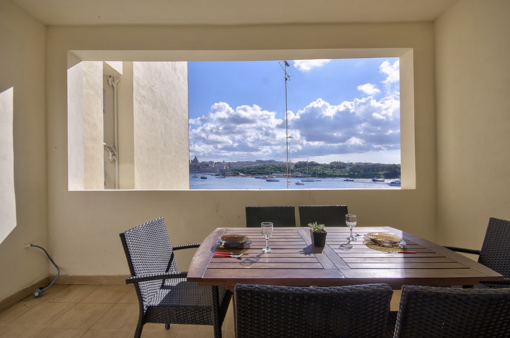Cet appartement en question est au 2ème étage avec ascenseur. A l'entrée, il a un salon spacieux menant à la salle à manger / cuisine où elle conduit à une porte en verre, donnant sur une terrasse avec vue sur la mer de Sliema. La terrasse est toute équipée pour 4 personnes. Cet espace est idéal pour passer une journée de détente au soleil ou encore pour un dîner aux chandelles en plein air. La cuisine est entièrement équipée.