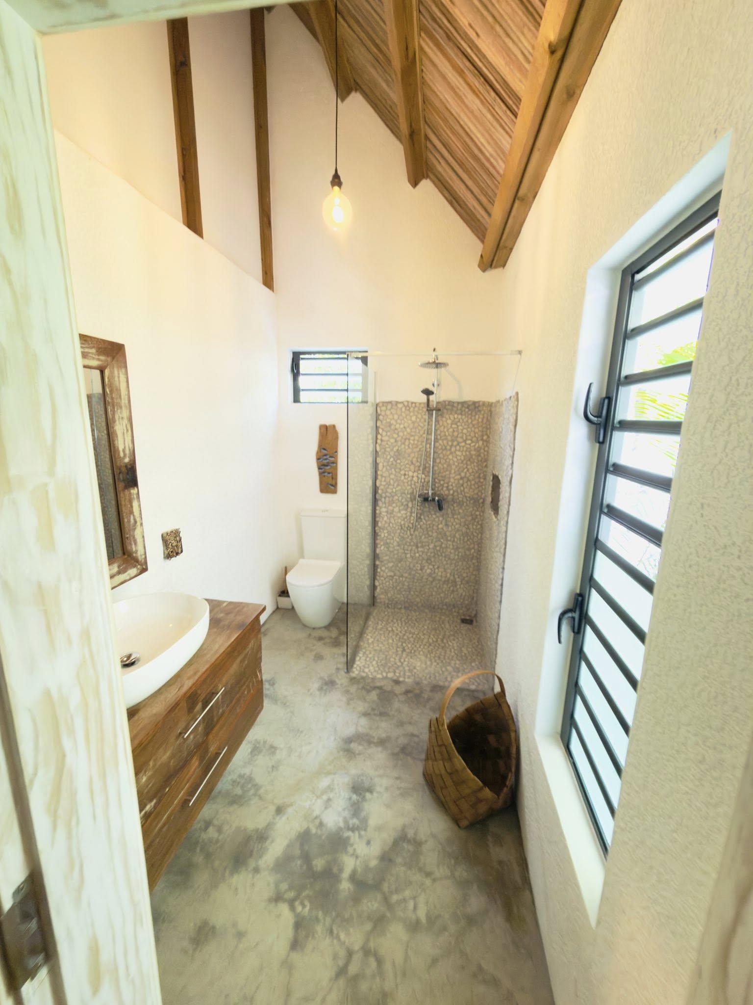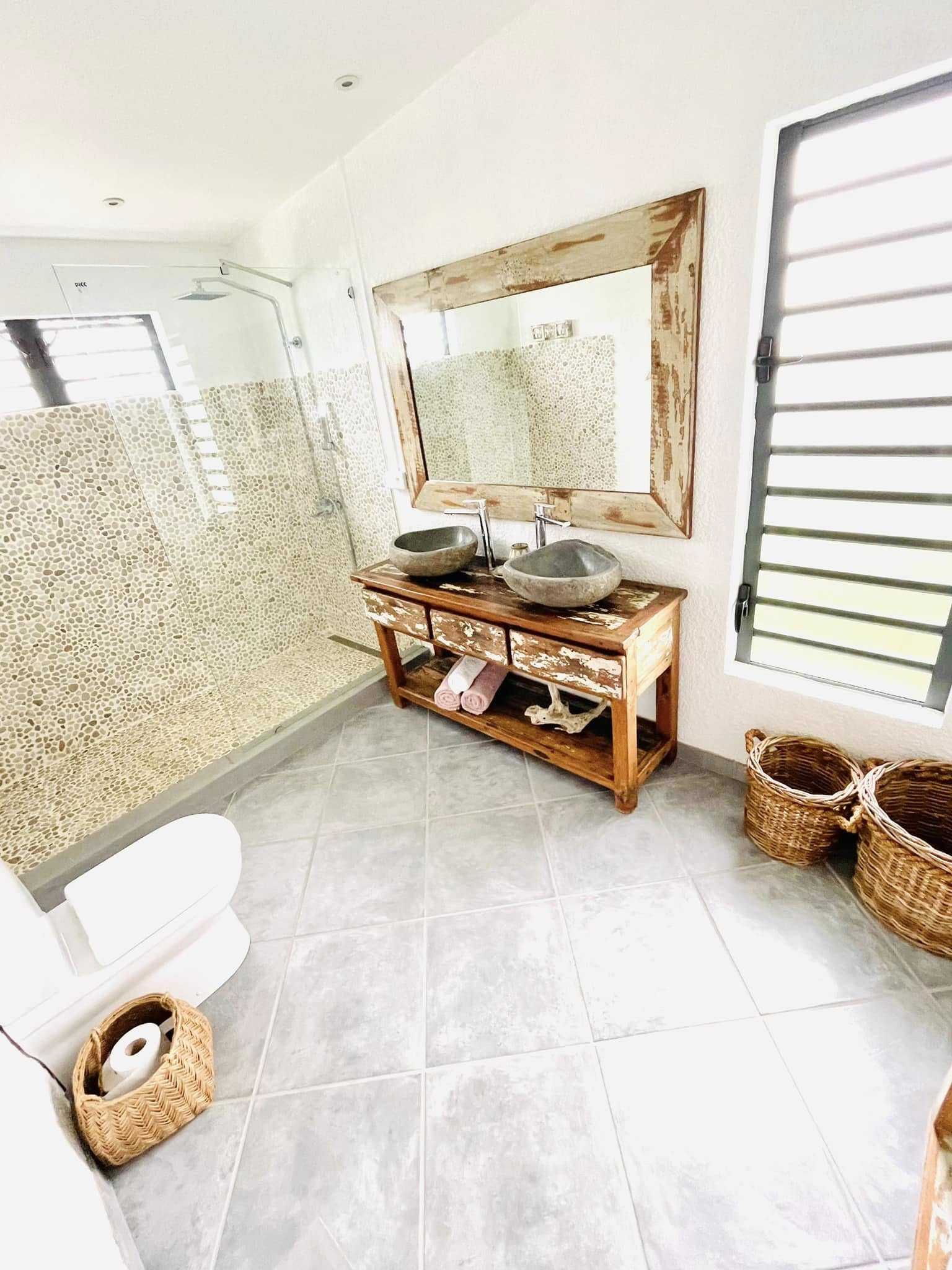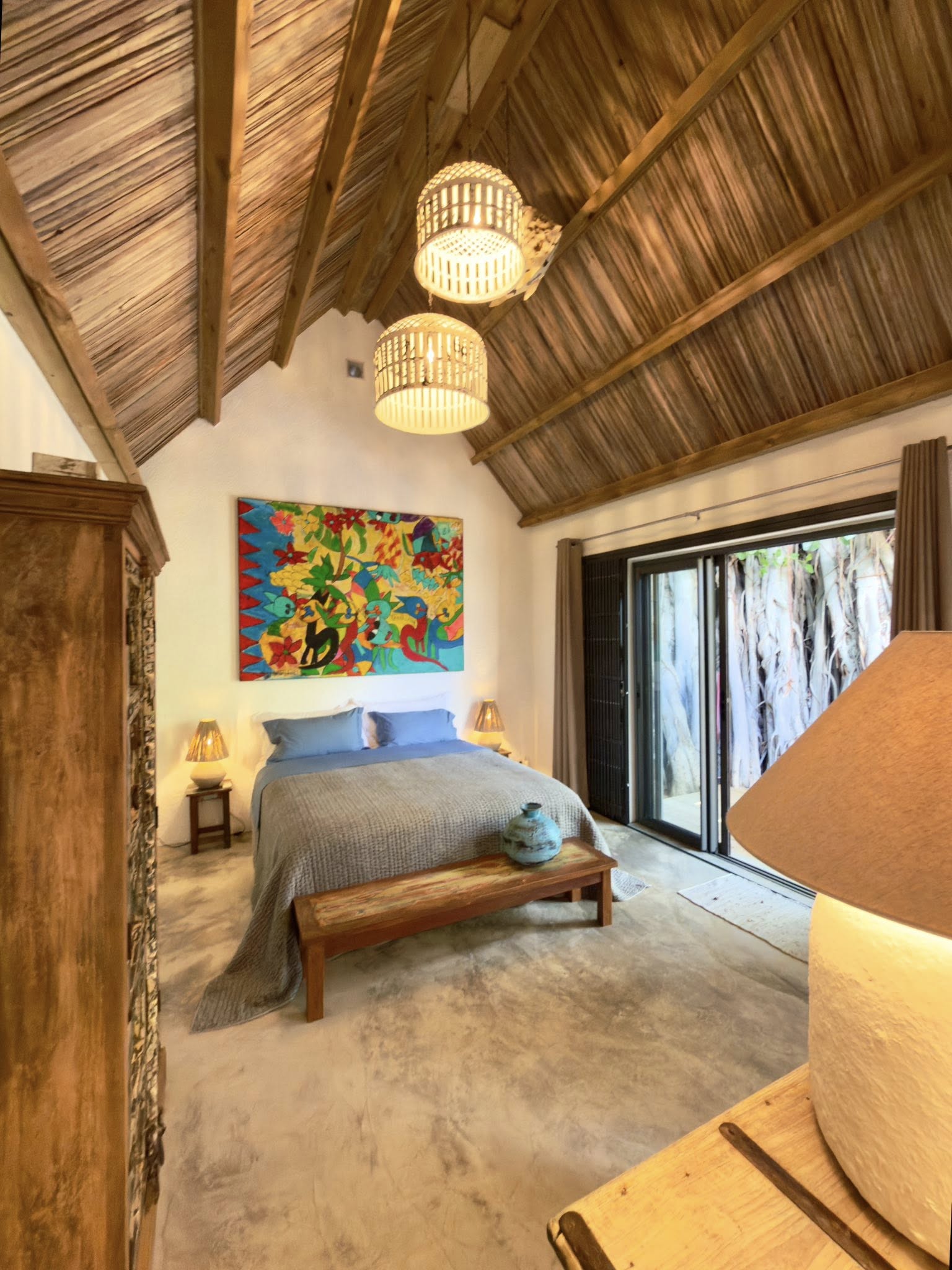 Trois chambres dans la villa principale, chacune avec sa propre salle de bain privative.