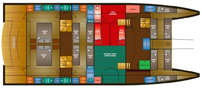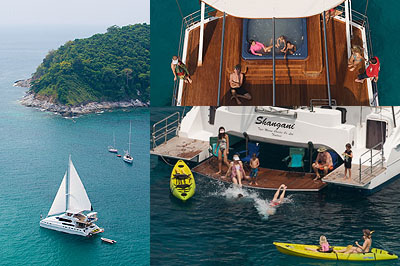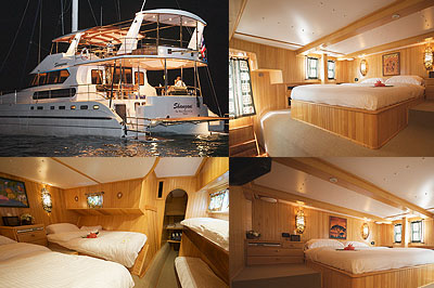 Conçu les croisières offrant confort, plaisir et sécurité, ce magnifique catamaran peut accueillir jusqu'à 16 personnes dans les 2 doubles et 2 lits jumeaux / convertible en cabines doubles, toutes avec salles de bains, plus 2 cabines familiales avec chacune 2 lits simples et 2 lits superposés. Toutes les cabines sont climatisées 24 / 7. Le bateau est idéal pour les familles et les grands groupes, avec jacuzzi à bord, beaucoup de jouets, une équipe dédiée de 4, y compris le chef thaïlandais et masseuse thaïlandaise. Il ya 4 ensembles de matériel de plongée ainsi que d'un compresseur, et le capitaine est un moniteur de plongée certifié.